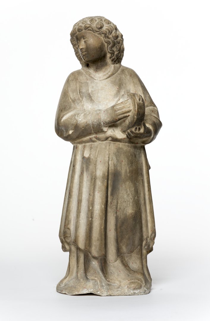 Raffigurante un “Angelo attero con tamburello”, la scultura in marmo di Candoglia è databile fra il quinto e il sesto decennio del Quattrocento. Proveniente dal capitello di un pilone del Duomo, si trova oggi esposta in Museo presso la sala n. 6, dedicata appunto alle statuette dei capitelli dei piloni.