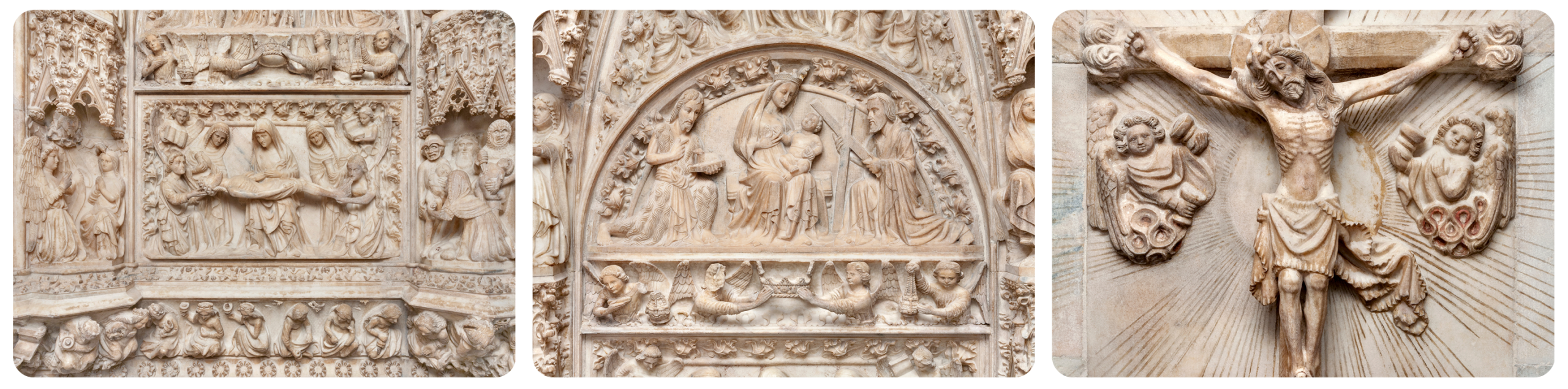Una vivacità che si ritrova anche nella scultura, partendo dal basamento con le Vergini sagge e stolte e le sei scenette con Storie di Maria e dell’Infanzia di Cristo della cornice; la narrazione prosegue poi con le tre scene centrali (Compianto sul Cristo morto, Madonna del Latte e Madonna della Misericordia) e si conclude nel Cristo crocifisso sulla sommità del portale.