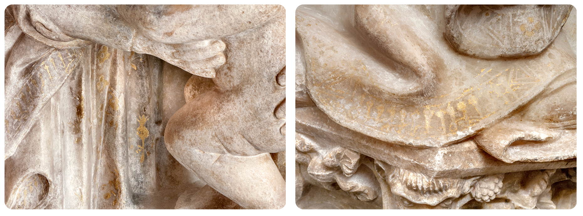 Il restauro del portale meridionale, condotto dalla ditta Aconerre, ha eliminato le patine di ossidazione e calcificazione prodotte sul marmo dall’umidità e dai fumi delle candele: questo ha riportato alla luce le tracce dell’originaria partitura pittorica policroma con finitura a foglia oro di Giovannino e Porrino de’ Grassi, che impreziosiva l’apparato scultoreo, sopravvissuta e chiaramente leggibile solo in determinati punti. Alcuni di essi risultano inaspettati perché certamente non visibili dal normale punto di osservazione del visitatore, a testimonianza di una straordinaria ricchezza decorativa il cui effetto doveva avvicinarsi a quello di un’oreficeria medievale, ancora di più che nel portale settentrionale.